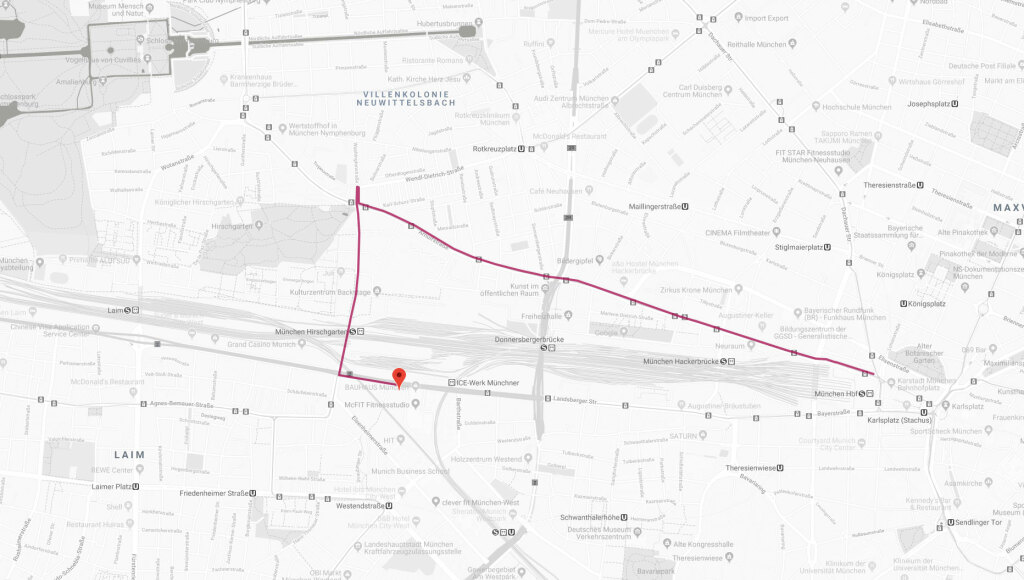 Fahre bis zum Hauptbahnhof und dann auf der Arnulfstraße stadtauswärts bis zum Steubenplatz. Rechts auf den Steubenplatz um dann nach ca 100m einen U-Turn zu machen, gerade über die Kreuzung auf die Wilhelm-Hale Straße, über die Friedensheimer Brücke und dann links auf die Landsberger Straße stadteinwärts. Das Studio befindet sich zwischen der Nachtgallerie und dem Bauhaus.